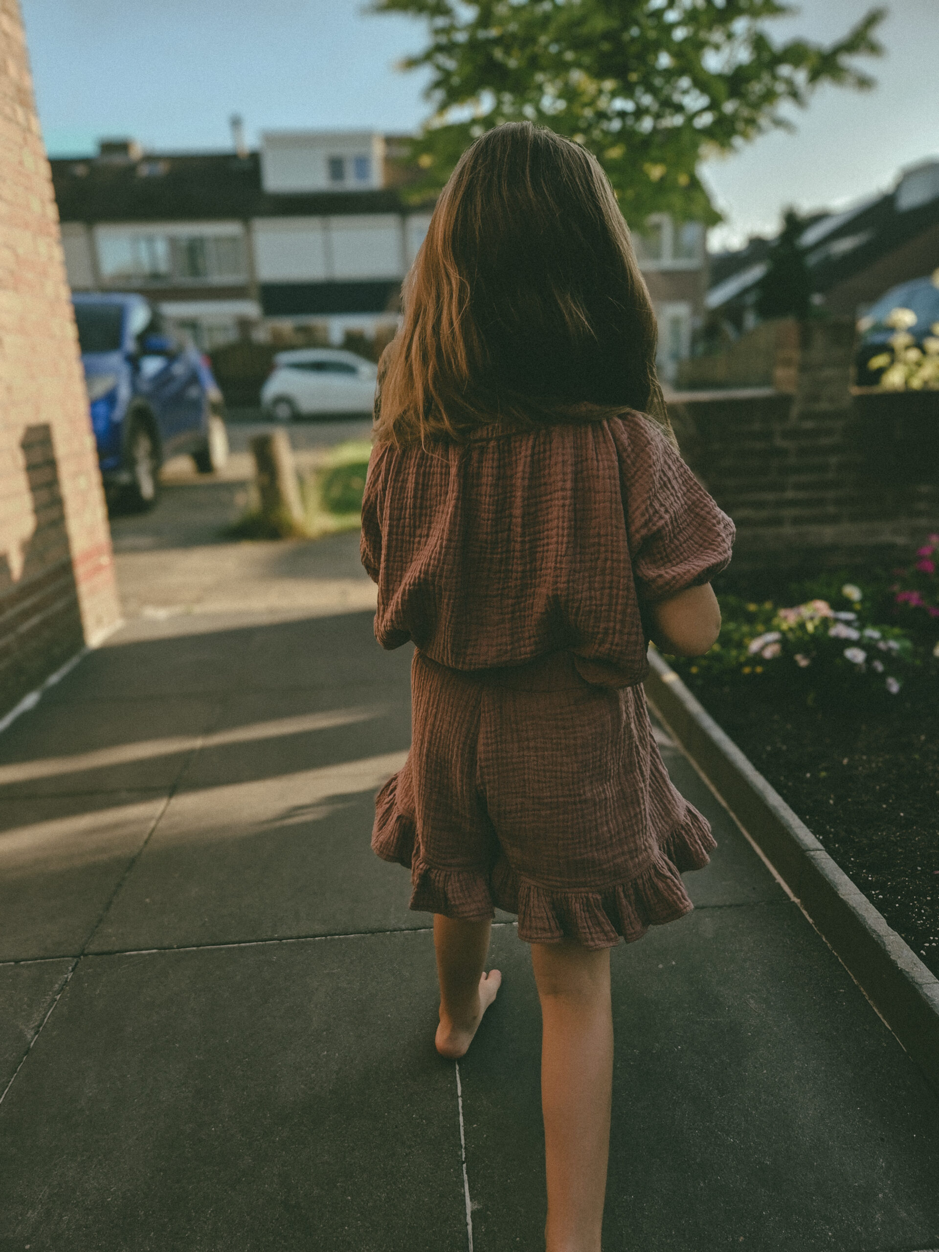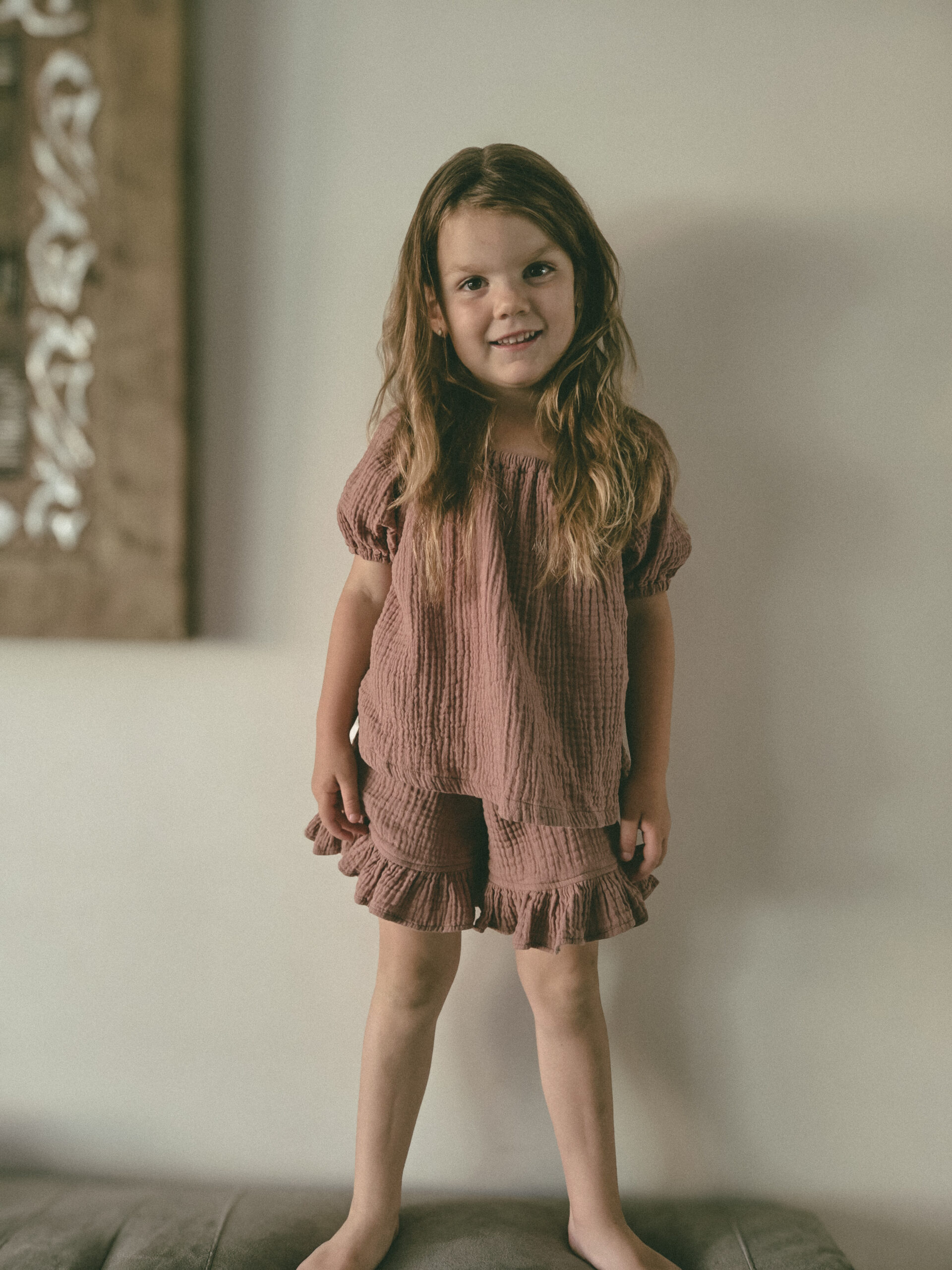 Deze lieve set is perfect voor warme dagen – comfortabel, luchtig en helemaal natuurlijk. Hij is gemaakt van zachte, ademende katoenen mousseline, ideaal voor de gevoelige huid van je kind. De stof irriteert niet, voelt licht aan en beweegt mooi mee, zodat je kleintje zich de hele dag vrij en prettig voelt.