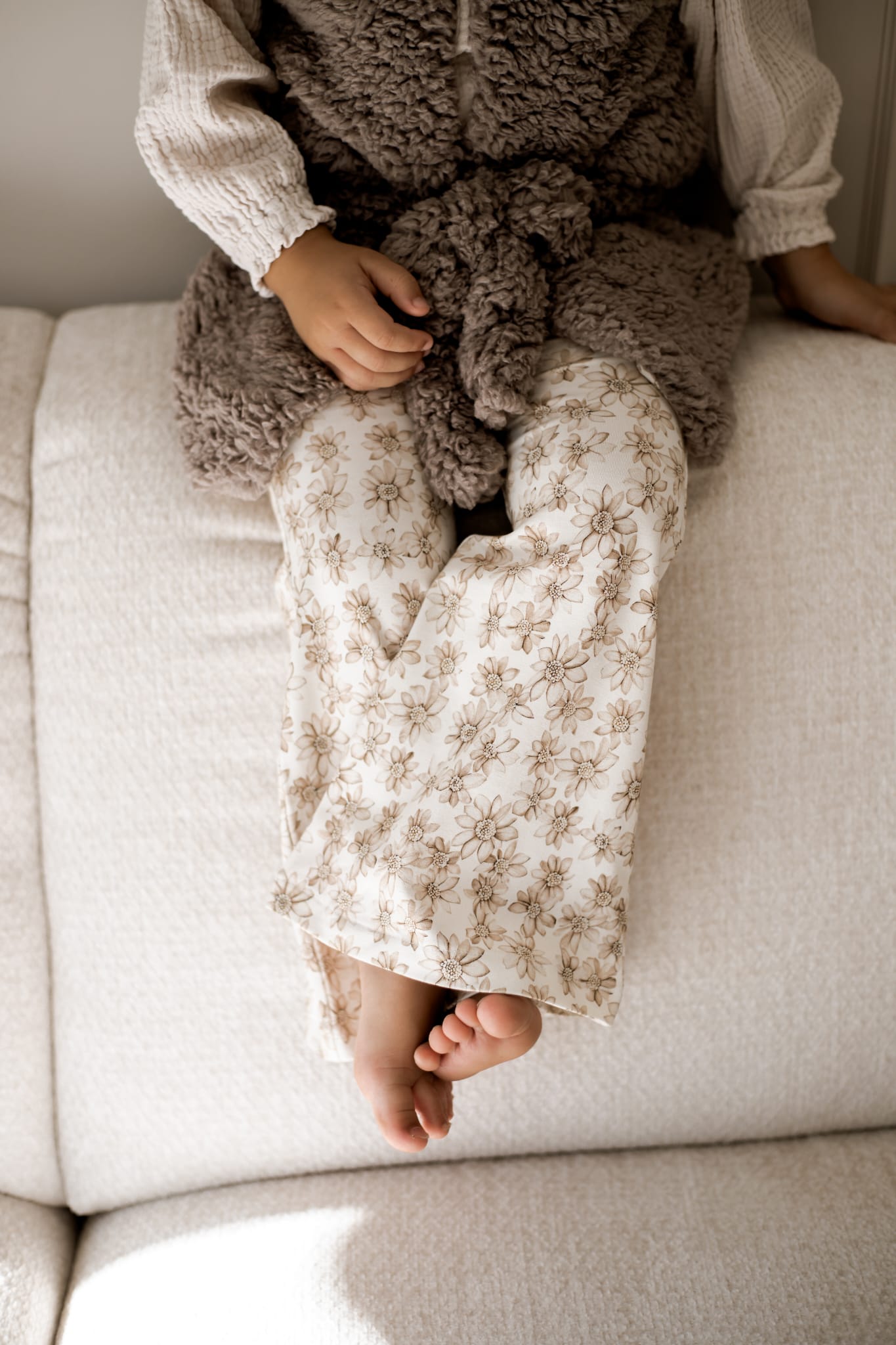 De broekjes hebben uitlopende pijpen vanaf de knieën en een zachte elastische tailleband,